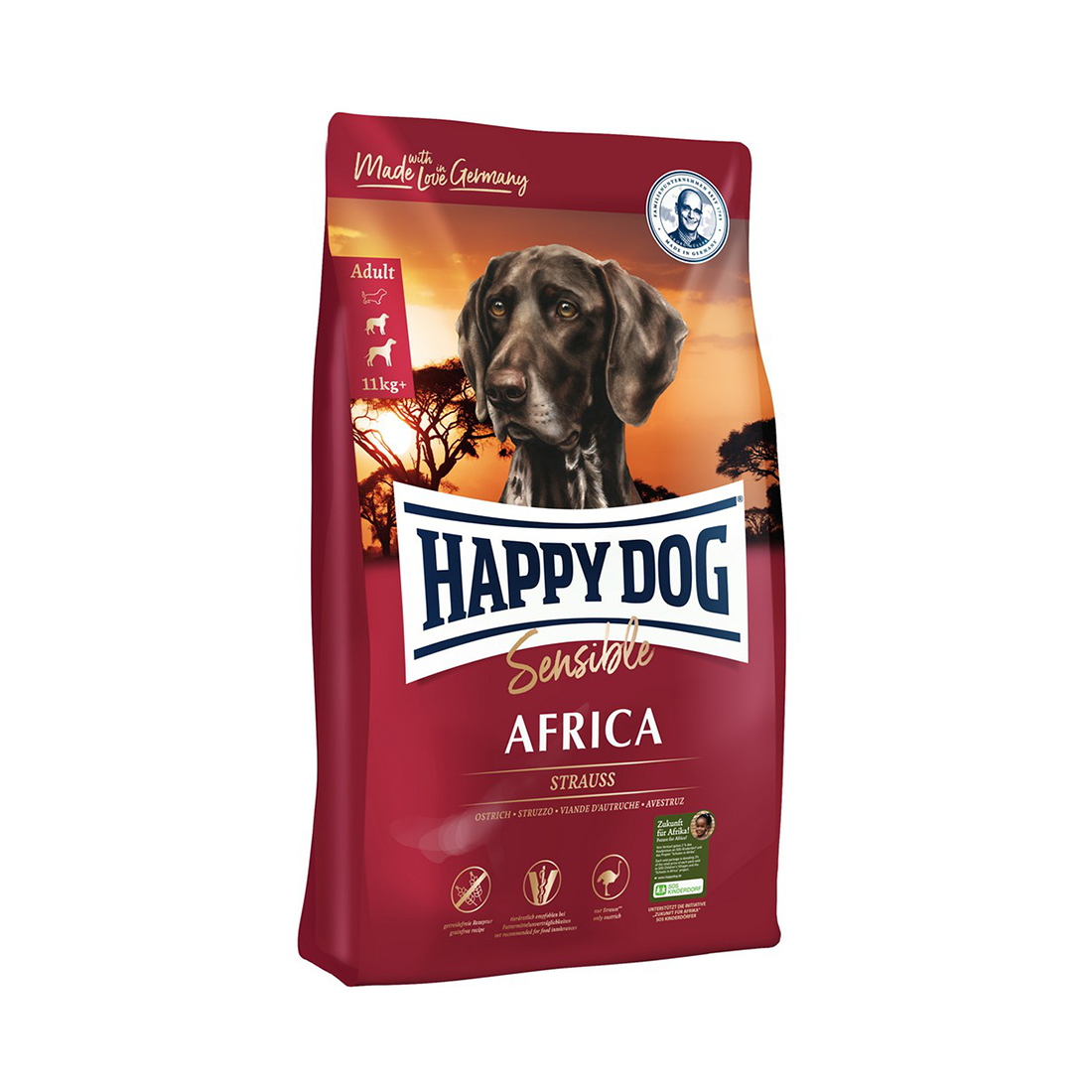 ugyanis a Happy Dog Africa a strucchúst és a burgonyát egyedülálló keverékké egyesíti. A strucchús, amely egy igen ritka fehérjeforrás, ideális táplálék az élelmiszer-intoleranciával küzdő kutyák számára. A burgonya nem tartalmaz glutént, ezért javasolható a gabonát rosszul tűrő állatok táplálására. Az egészséges bőr és a csillogó bunda szempontjából fontos omega-3 és omega-6 zsírsavak teszik teljessé a különleges receptet. A krokettek mérete optimális a közepes- és nagytestű fajták fogazatához. Németországban készült, szigorú minőség-ellenőrzési eljárások mellett.