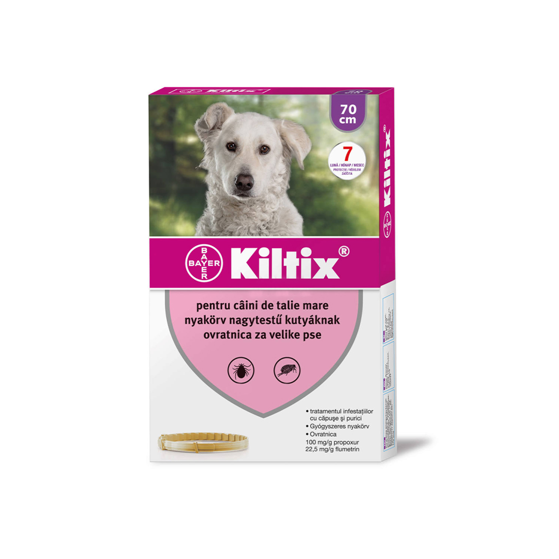 Kiltix kullancs- és bolhanyakörv kutyák részére. A nyakörv két hatóanyaga különlegesen hosszú, akár 7 hónapig tartó védelmet biztosít kutyájának a kullancsok és bolhák ellen.