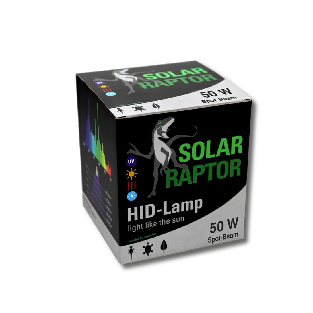 A Solar Raptor különleges fémhalogén normál izzó, mely a lehető legjobb fényforrás hüllőknek, kétéltűeknek és madaraknak. Különleges, nagy intenzitású kisülésekkel szinte tökéletesen szimulálja a napfényt. Az egyik legerősebb izzó, mégis rendkívül valósághű színeket és árnyalatokat kölcsönöz a terráriumnak (86%-ban valós színvilágot ad). Fényerején túl UV kibocsátása is a Napéval vetekszik, a hüllők biztosan nem szenvednek majd hiányt a számukra létfontosságú UV-A és UV-B sugárzásból.