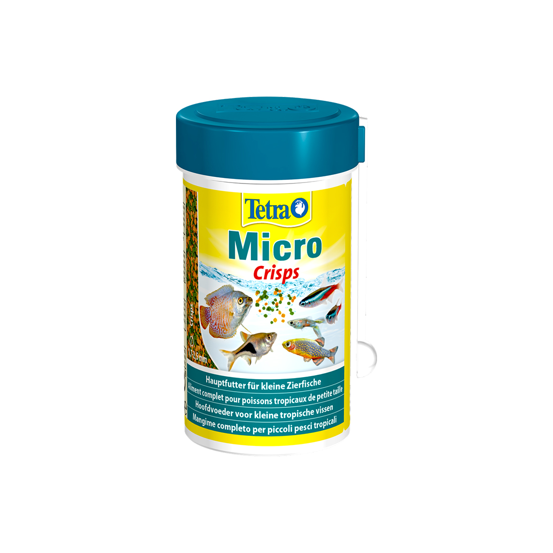A Tetra Micro Crisps eledel kifejezetten teljes értékű táplálék minden típusú, a víz felső és középső régióiban etethető, kisméretű díszhal számára. Az 1,7-2,5 mm-es átmérőnek köszönhetően még az apró szájú halak is könnyedén el tudják fogyasztani. Az apró szemű Tetra Micro Crisps ennélfogva ideális választás kisméretű halak számára, hiszen a szemek gyorsan felpuhulnak a vízben, így könnyedén fogyaszthatók. A Tetra Micro Crisps kiváló minőségű tápanyagokat tartalmaz, és kiegyensúlyozott, növényi és állati alapú összetevőkből álló formulát kínál. Ily módon minden olyan összetevőt biztosít, amely a növény- és húsevő halak számára az igényeikre szabott, kiegyensúlyozott étrendhez szükséges. A piros szemek karotintartalma ezenfelül fokozza a halak színdinamikáját, míg a zöld szemek növényi alapanyagokból készültek, így hozzájárulnak az egészséghez és a vitalitáshoz. A teljes értékű táp ezenfelül rendkívül kiválóan emészthető, amely segít a víz tisztán tartásában. Összességében a Tetra Micro Crisps ideális, teljes értékű táplálék minden típusú kisméretű díszhal számára, valamint a fiatal, fejlődésben lévő bölcsőszájúhal-félék és tengeri halak számára egyaránt.