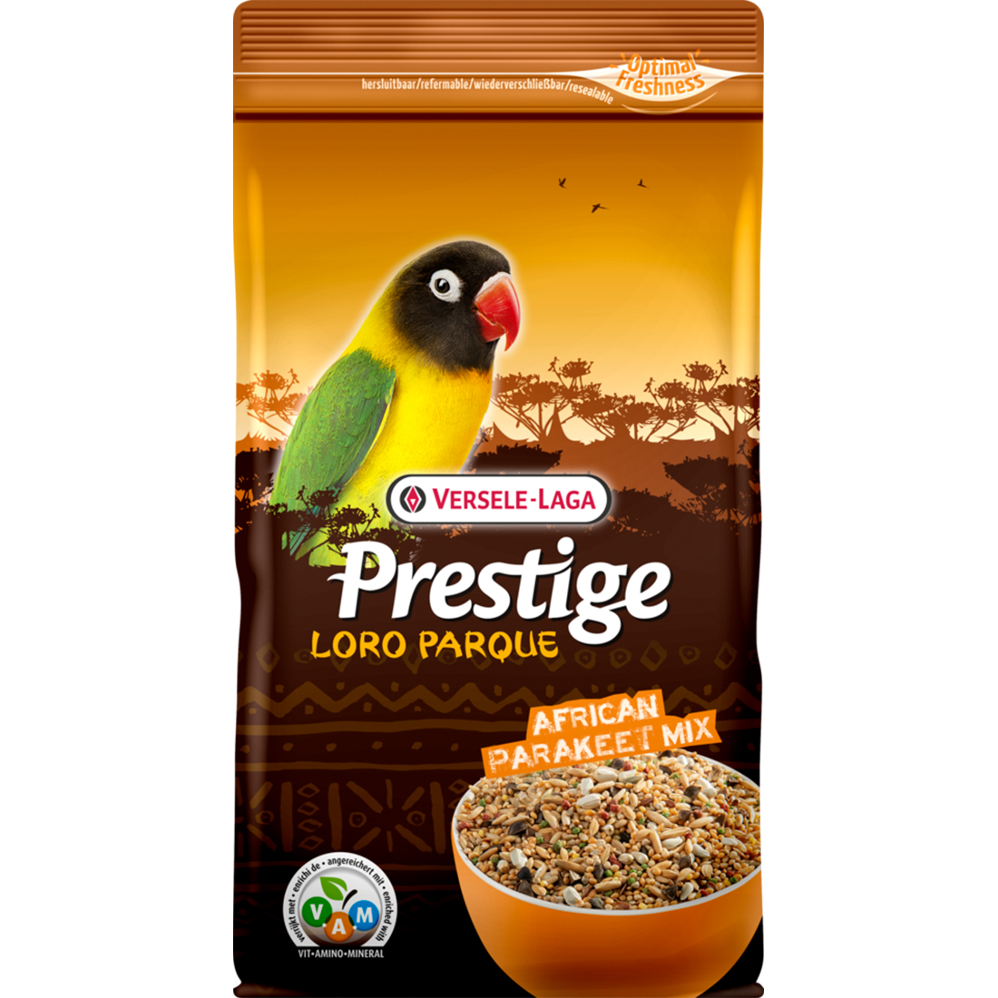 A Premium African Parakeet magkeverék és speciális szemcsék keveréke minden olyan összetevővel, ami jó kondícióban tartja a agapornisokat, nimfa és a hasonló élőhelyen előforduló kistestű papagájokat. Alacsony zsírtartalmú, és különféle olyan szemcséket is tartalmaz, melyek csemegének számítanak a a papagájok számára, pl. puffaszott gabonaszemek, tökmag, csipkebogyó, szárított bors-félék és fenyőmag. Gondosan válogatott magokból és 8%-ban különleges, extrudált Maxi VAM-szemcsékből áll (VAM = Vitaminok, Aminosavak, Ásványi anyagok (= Minerals – M). Ezen felül a VAM-szemcsék egy speciális anyagot, Florastimul-t tartalmaznak, ami elősegíti az optimális bélműködést és a kiváló kondíciót.