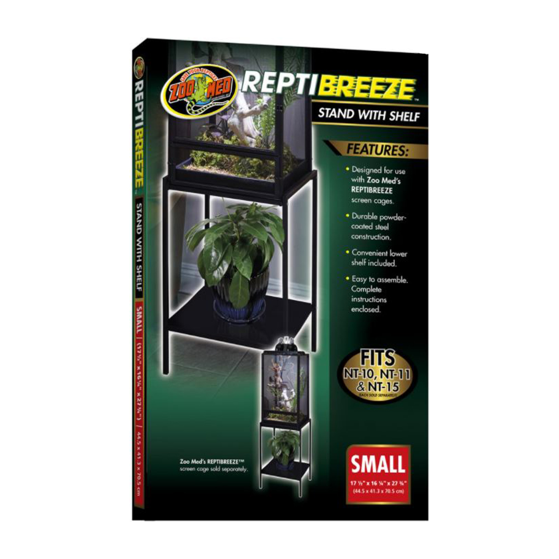 A ZooMed ReptiBreeze fekete acél állvány polccal egyszerűen összerakható feketére fújt rozsdamentes acél állvány, mely a ZooMed ReptiBreeze S, ZooMed ReptiBreeze M hálós terráriumokhoz készült, valamint a ZooMed ReptiBreeze LED Deluxe M ketreccel kompatibilis. Az állvány ízléses kelléke a ketrecnek, direkt úgy tervezték, hogy a hálós terrárium tökéletesen illeszkedjen rá. Az állványon található egy polc is, melyre a kisebb kellékeket, felszereléseket, pl. automata párásítórendszert tehetjük, de egy dekoratív növény is helyezhető rá.
